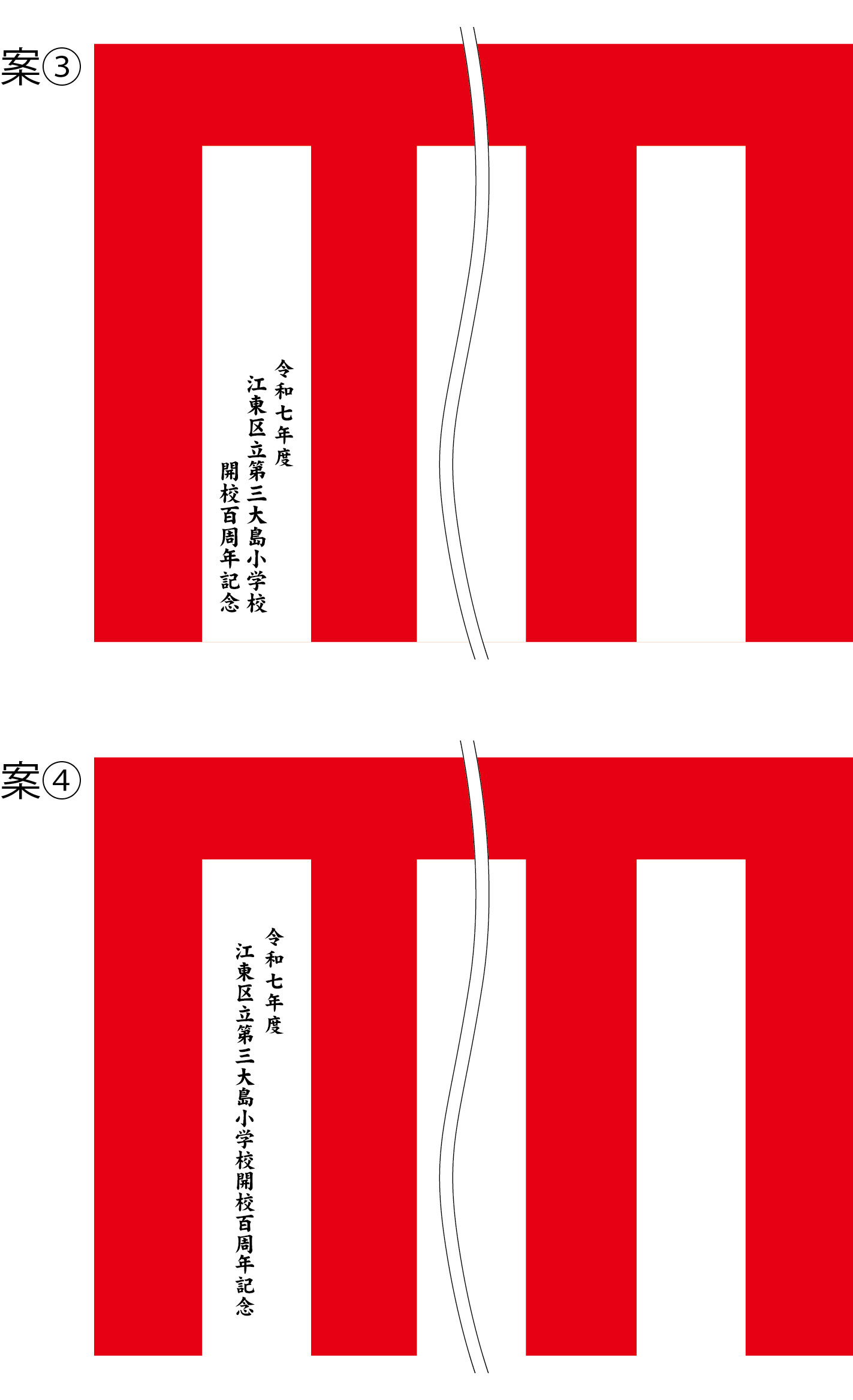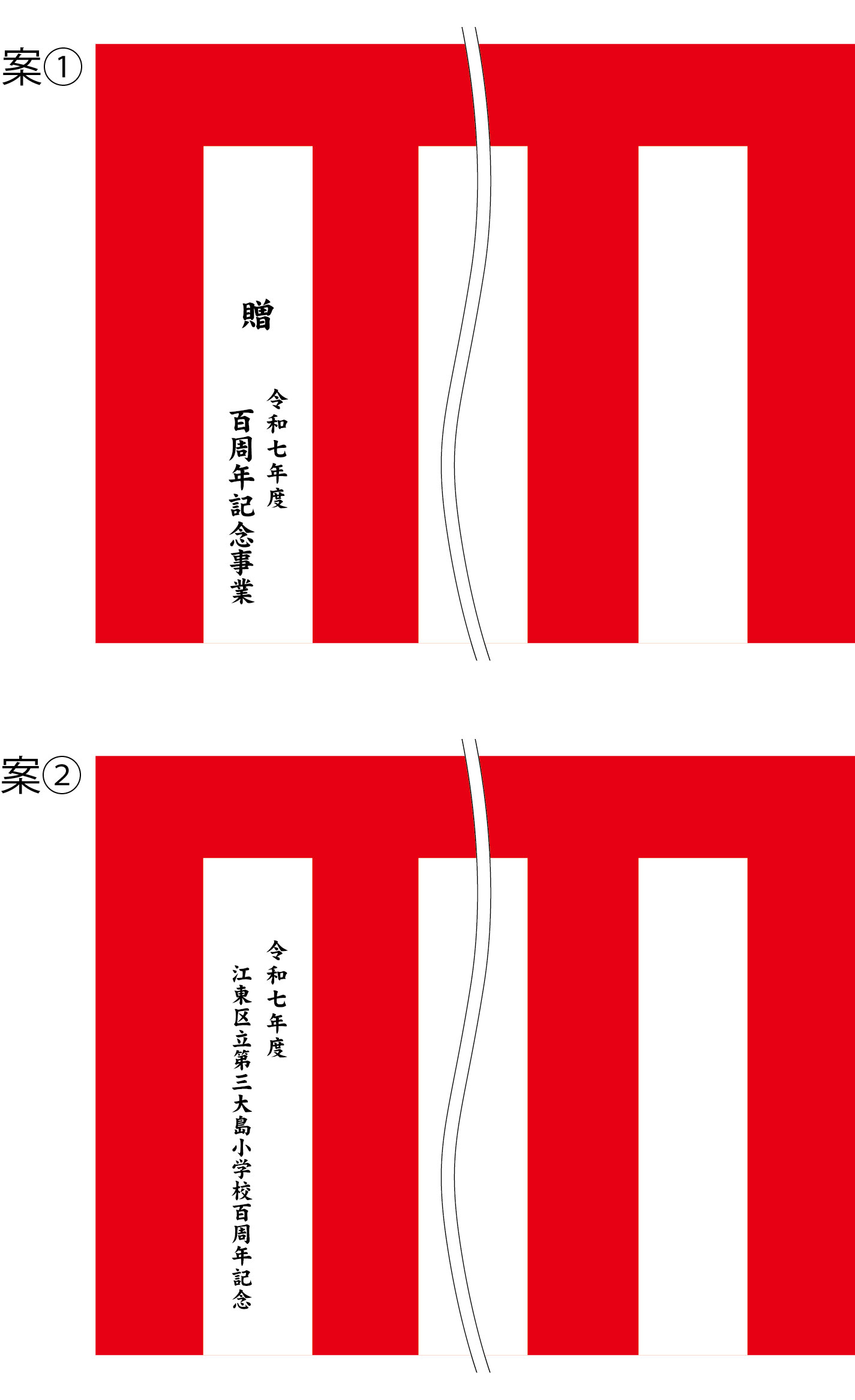 印刷する文字内容を「令和七年度 江東区立第三大島小学校 開校百周年記念」に変更しました。3行組の場合と2行組の場合の2通りの原稿案を作成いたしましたのでご検討のほどよろしくお願いいたします。