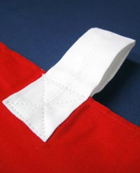 赤と白の生地を縫いつないであります。裾の部分は三巻縫製をしてあります。 |